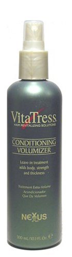 -. Feature : Leave-in treatment adds body, strength and thickness. / VitaTress® Conditioning Volumizer is an extaordinary leave-in treatment that adds volume, fullness and body to fine, thin, fragile hair. / The micro mist spray evenly disperse a synergistic blend of Botanicals, Amino Acids and Wheat protein into the hair, adding strength and volume to each strand while detangling. / Nexxus is dedicated to making the world's finast professional products for hair and skin care; Never tested on animals