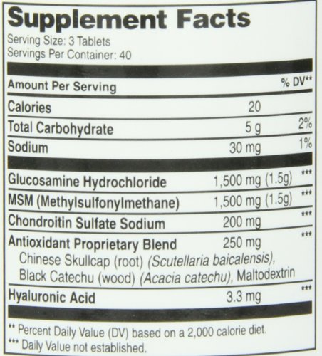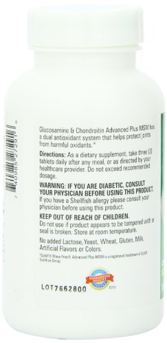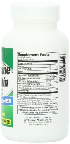 21st Century Glucosamine & Chondroitin Advanced + MSM 120 Tab has a dual antioxidant system that helps protect joints from harmful oxidants. For Your Health: Unconditionally guaranteed for purity, freshness and label potency. No added Lactose, Yeast, Wheat, Gluten, Milk, Artificial Flavors or Colors. Directions: As a dietary supplement, take three (3) tablets daily after any meal, or as directed by your healthcare provider. Do not exceed recommended dosage. Warning: If you are diabetic, consult your physician before using this product. If you have a Shellfish allergy please consult your physician before using this product.Feature