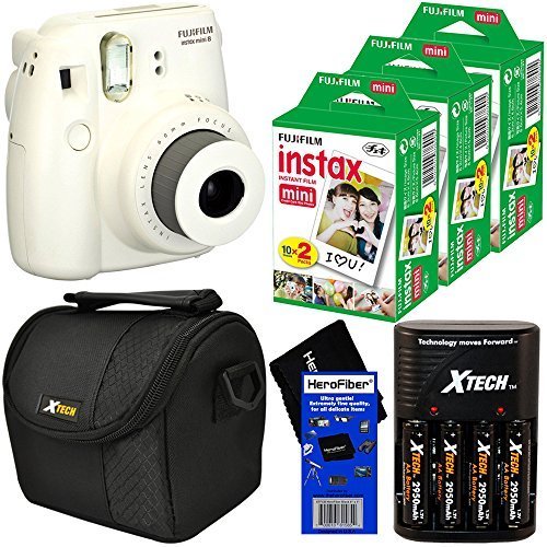 Fujifilm Instax Mini 8 Instant Film Camera (White) + Fujifilm Instax Mini Instant Film (60 sheets) + 4 AA High Capacity Rechargeable Batteries with Battery Charger + Well Padded Camera Case + HeroFiber Ultra Gentle Cleaning Cloth