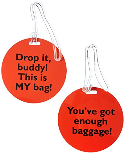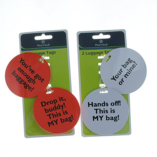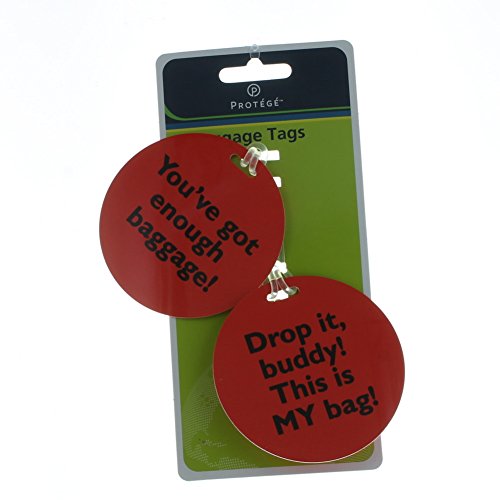 Product Description Perfect for luggage, golf bags, school bags or camera bags.? Tags have humorous sayings on the front.? Spaces for your name, address and phone number on the back? Tags measure 3 1/4" diameter. 0