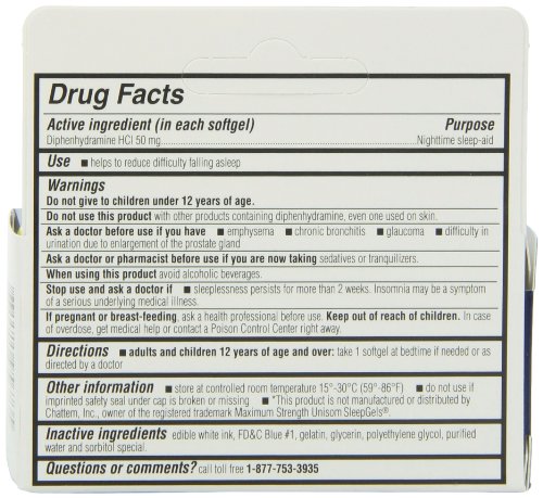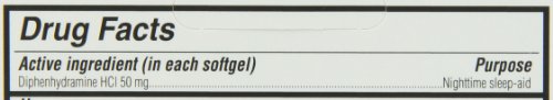-. Feature : Active Ingredient: Diphenhydramine HCl 50mg. per softgel / Compare to the active ingredient in Maximum Strength Unisom Sleepgels / Helps reduce difficulty falling sleep / Easy to swallow