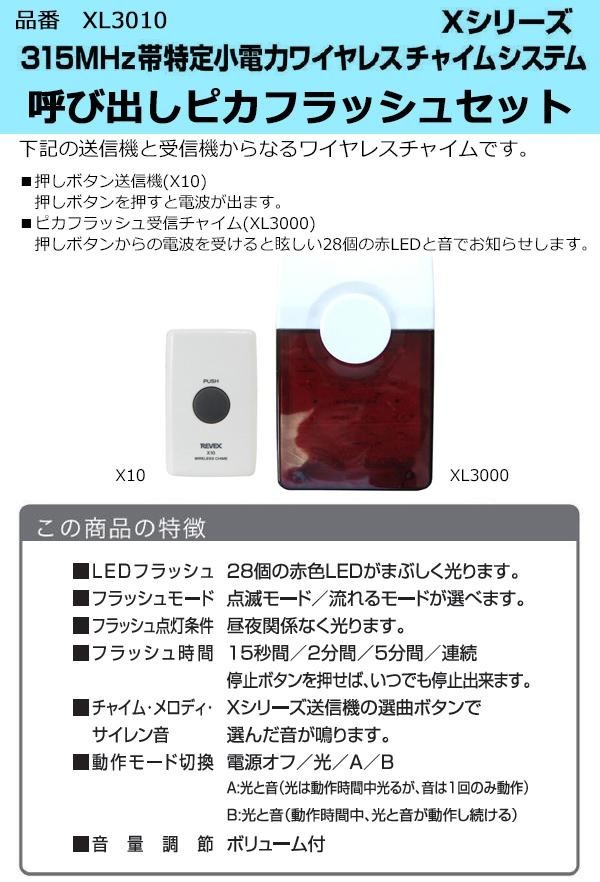 押しボタンを押すと、離れた場所にある受信機が光とチャイム音でお知らせします。防沫型なので屋外でも使用可能!!工場や倉庫、騒音場所での連絡用や独居高齢者対策など、様々な場所でご使用いただけます。※受信機(XL3000)には電池もアダプターも付属しておりません。 |