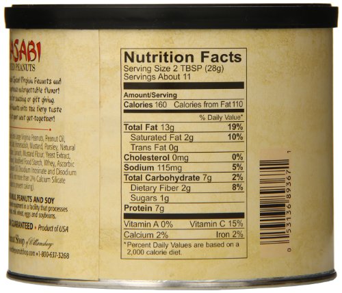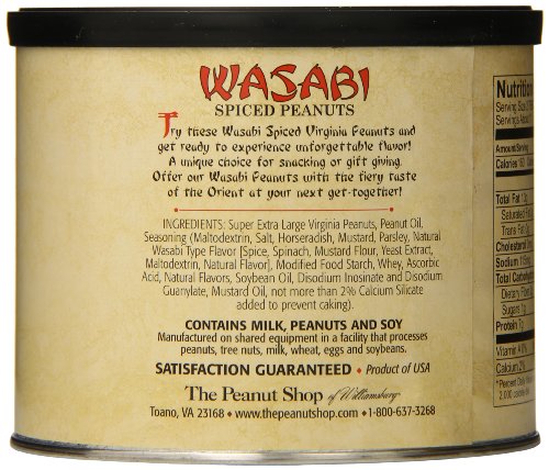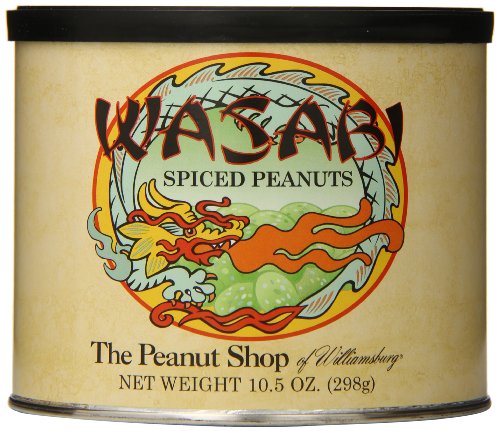 -. Binding : Grocery -. Brand : The Peanut Shop of Williamsburg -. EAN : 0053136893671 -. Feature : The surP.R.Ising taste sensation you've been searching for / Zesty wasabi flavor of traditional Japanese horseradish paired with our hand cooked peanuts / Wasabi-flavored spices add eye-opening zing to these terrific nuts / Enjoy the fiery taste of the orient at home, or serve them at your next get-together / Made in the U.S.A -. Label : The Peanut Shop of Williamsburg -. Manufacturer : The Peanut Shop of Williamsburg -. NumberOfItems : 1 -. PackageQuantity : 1 -. ProductGroup : Grocery -. ProductTypeName : GROCERY -. PublicationDate : 2014-04-10 -. Publisher : The Peanut Shop of Williamsburg -. ReleaseDate : 2014-04-10 -. Size : 10.5 Ounce -. Studio : The Peanut Shop of Williamsburg -. Title : The Peanut Shop of Williamsburg Wasabi Seasoned Peanut Tin, 10.5 Ounce -. UPC : 053136893671