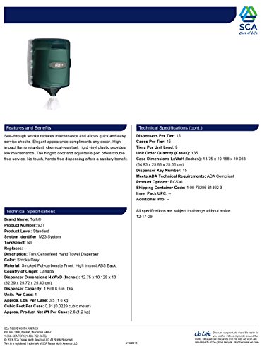 Tork 93T Centerfeed Hand Towel Dispenser, Plastic, 12.75" Height x 10.125" Width x 10" Depth, Smoke, (Case of 1 Dispenser) For use with Tork RC530