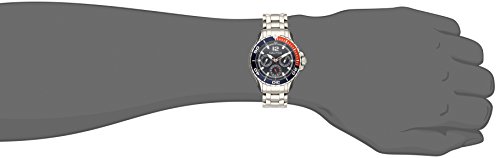 -. Feature : Round watch featuring dive-style bezel, luminous hands/indices, and three subdials / 38 mm stainless steel case with mineral dial window / Quartz movement with analog display / Stainless steel bracelet and fold-over clasp with double push-button safety / Water resistant to 100 m (330 ft): In general, suitable for swimming and snorkeling, but not scuba diving