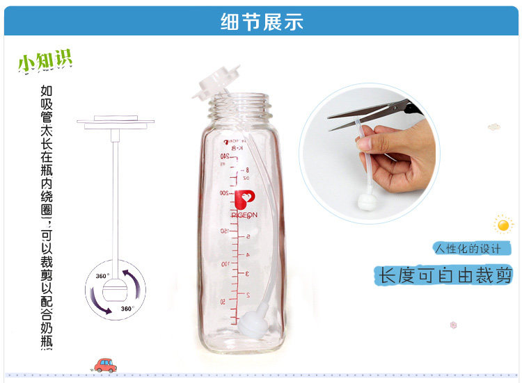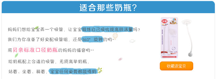 给奶瓶配上合适的吸管,无须高举奶瓶,站着、坐着、躺着,任何姿势都能喝奶,可以锻炼宝宝自己吸吮,提高肺活量,并可减少宝宝吸入空气、吸奶、打嗝和呛奶等现象。 |