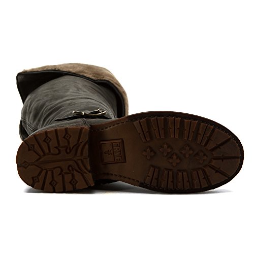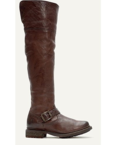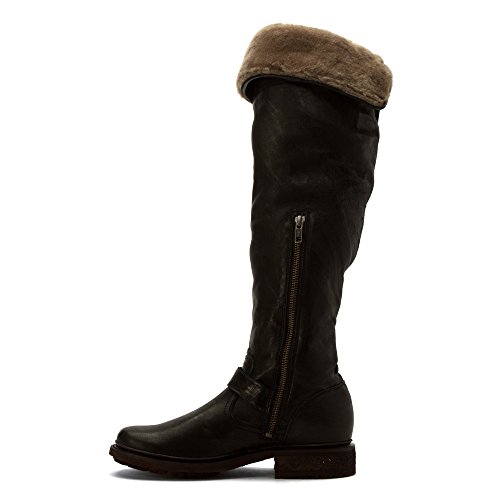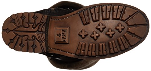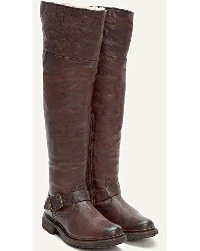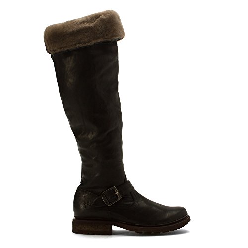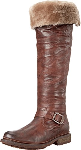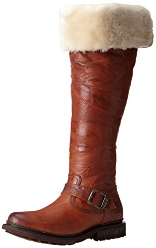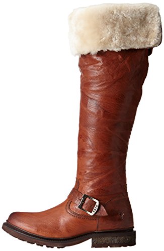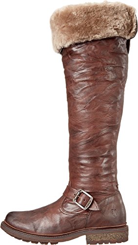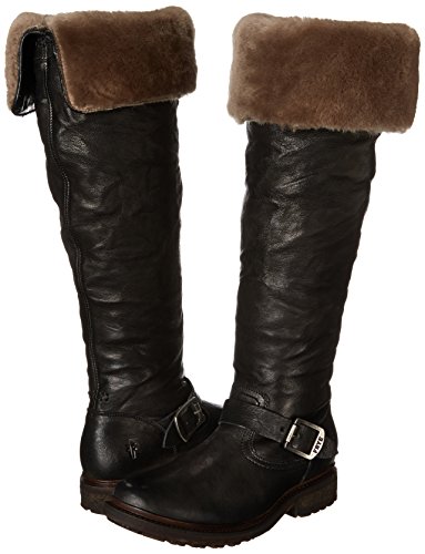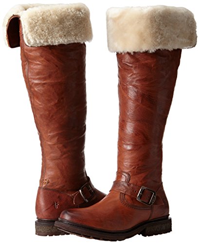 Product DescriptionWrinkled leather Frye moto boots feel modern with a fold-over, knee-length shaft and full shearling lining. A sturdy lug sole complements the rugged look, and an inset crepe panel cushions the chunky heel. Exposed side zip.0