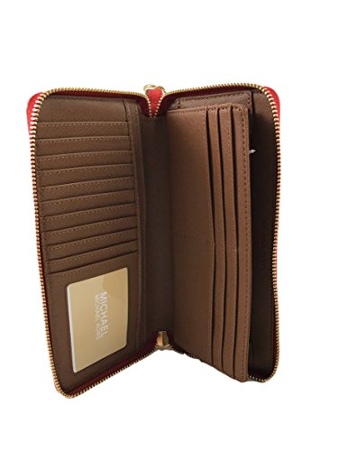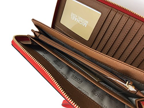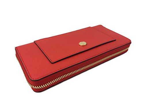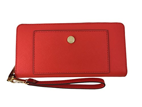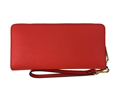 -. Feature : Saffiano Leather with gold tone hardware. / Approximate measurement: 8.25" W x 4" H x 1" D. / Interior: ID window, 1 zipper pocket, 16 credit card slots, 3 full length bill compartments, and 3 multifunctional full length slots. / Zip around closure. / Removable wristlet strap. Drops 7.25"