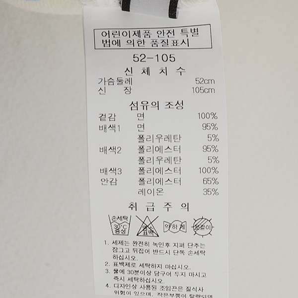 제품소재 : 겉감: 면100%배색1: 면 95% 폴리우레탄5%배색2: 폴리에스터95% 폴리우레탄5%배색3: 폴리에스터100%안감: 폴리에스터65% 레이온35%