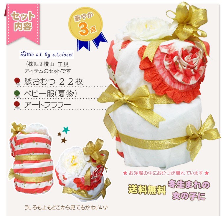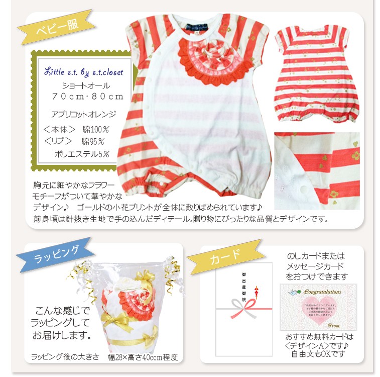胸元のフラワーモチーフが華やかなショートオールをおむつケーキに仕立てました。ゴールドラメの小花プリントや針抜き生地など丁寧なディテール。冬生まれの女の子向けの出産祝いにぴったりです。ベビー服の中にはおむつが隠れています。 当店だけのベビー服のおむつケーキは記憶に残るギフトになるはず・・・<使用するおむつ> パンパース(テープタイプ)22枚 S,Mから選択できます。<ベビー服> 70cm:9kg (標準的なベビちゃんの半年前後用) 80cm:11kg (おおきめベビちゃんの半年前後) から選択できます。<付属品> ・littles.t by s.t closet ショートオール ・アートフラワー<のし、メッセージカード> 無料でお付けできます。(のしかカードかどちらかとなります) メッセージ内容は当店が用意しました定型メッセージと自由な文面をお選びいただけます。 ※60文字程度までが収まりがいいです。<おむつケーキの本体サイズ> 幅20cm×高さ30cm出産祝い おむつケーキ ベビー服 冬生まれ 女の子