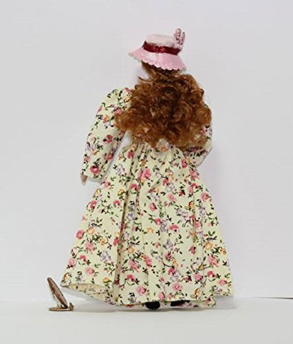 -. Feature : Dollhouse Miniature 1:12 Scale Doll / Victorian Lady Doll in a Cream Floral Dress with Pink Hat & Parasol