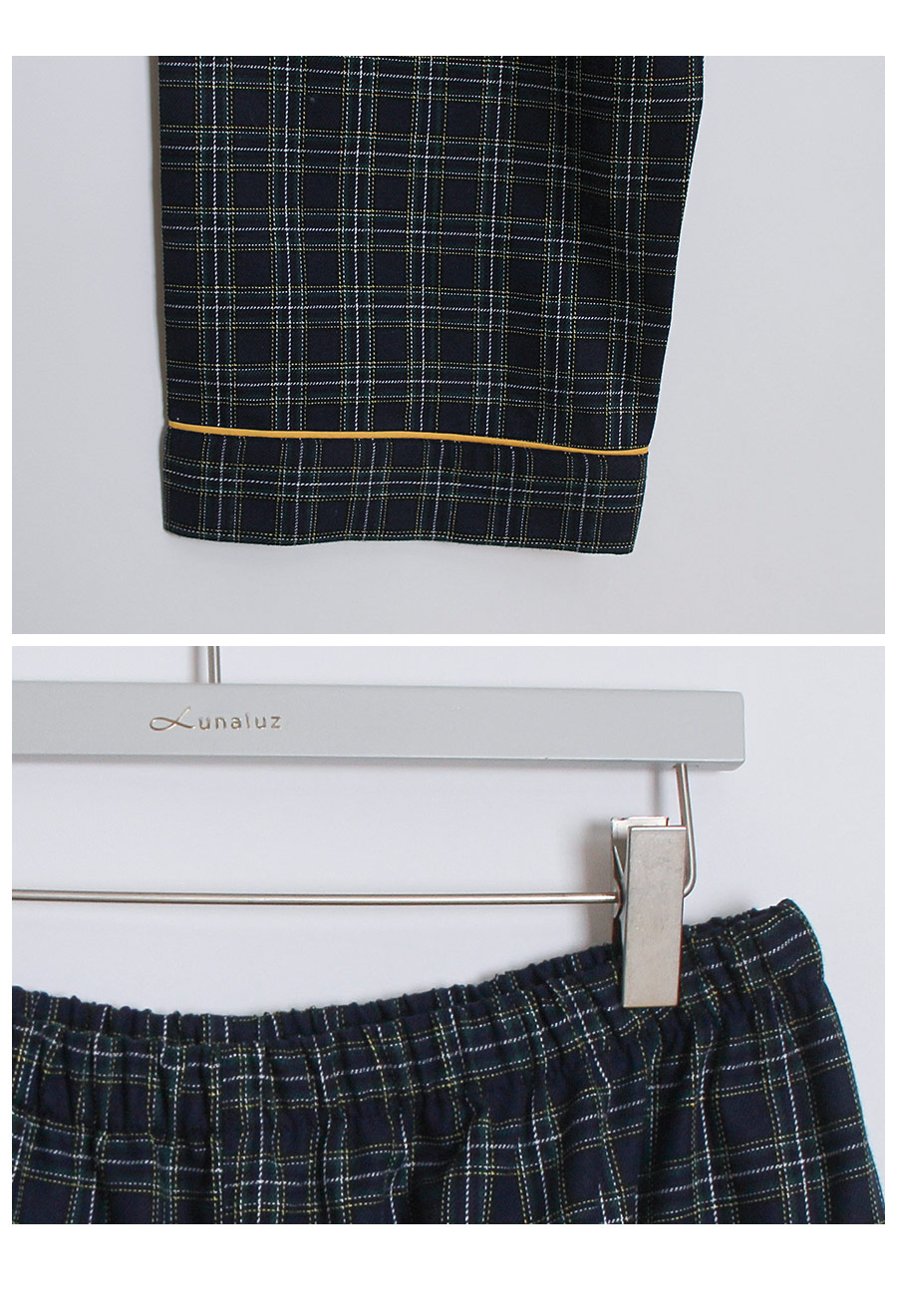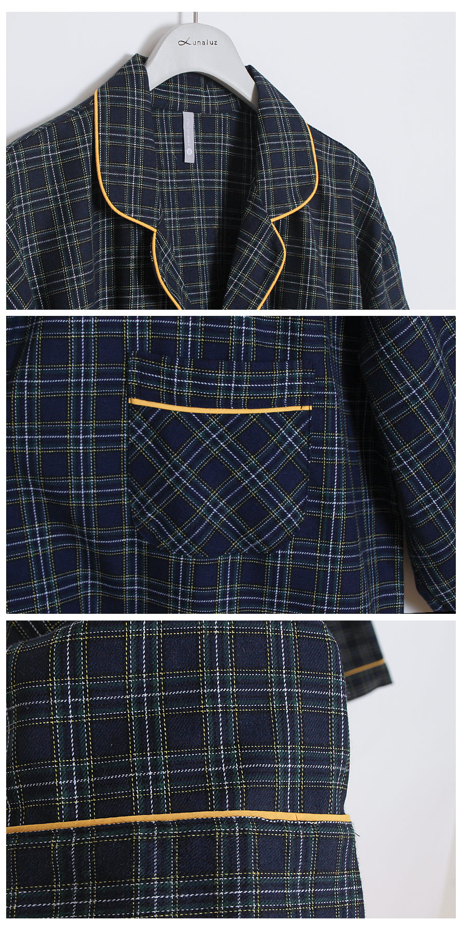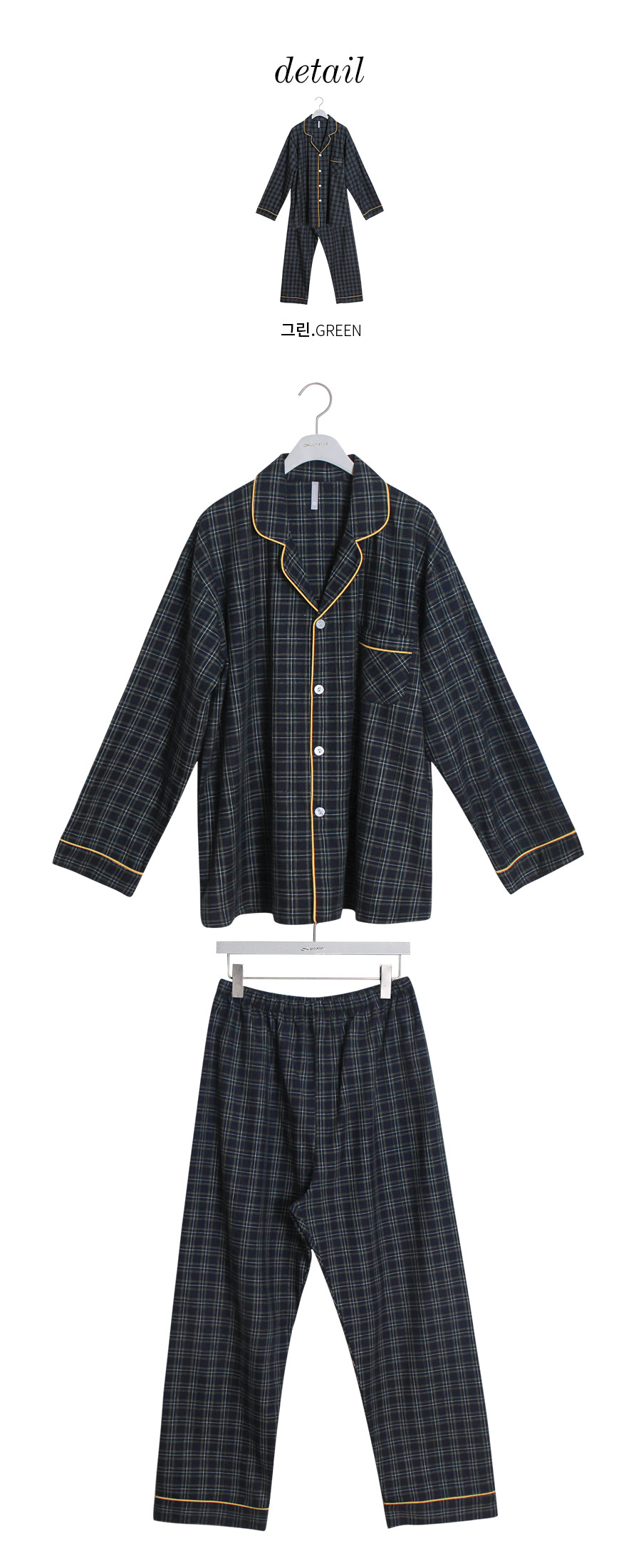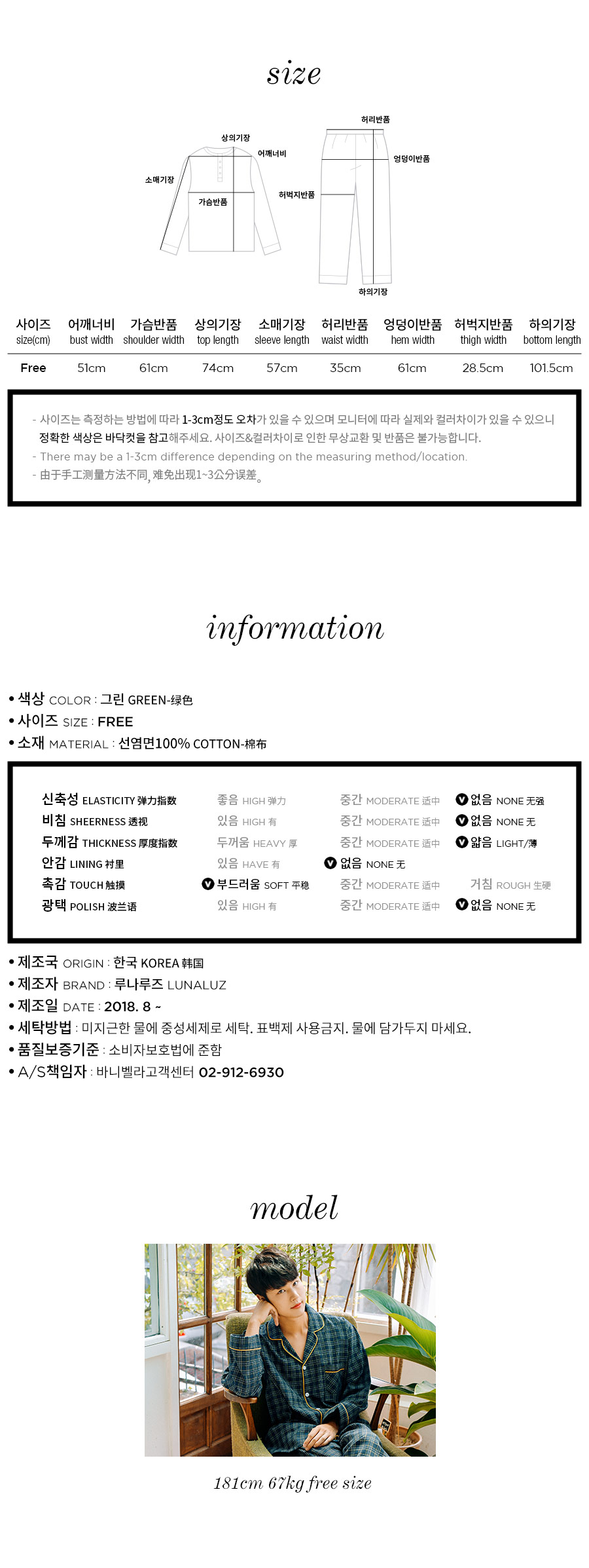 고급스러운 딥한 그린 컬러의 체크 파자마 세트 에요. 톤 다운 된 컬러감으로 한 층 더 세련된 무드를 느끼실 수 있습니다. 전 연령 두루두루 잘 어울릴 스타일의 깔끔한 파자마 세트로 적극 추천해드려요. 직접 실을 염색해 짠 선염면 조직의 파자마 세트로 탄탄하고 훨씬 고급스럽습니다. 흐트러짐 없는 조직감으로 오래 꺼내 입을 수 있는 fw파자마 세트랍니다. DETAIL 깔끔한 포켓 카라 스타일의 디자인으로 질리지 않고 계속해서 꺼내 입을 수 있는 파자마세트 입니다. 네츄럴한 핏으로 편안하게 연출하기 좋습니다. 카라의 끝 부분부터 클로징 버튼까지 옐로 컬러의 파이핑을 봉제 해 화사하게 포인트를 주었습니다. 소매 부분과 팬츠의 하단에도 파이핑을 둘러주었습니다. 100% 국내 제작으로 소재, 디자인, 봉제의 퀄리티가 높습니다. SIZE 100size에게 적합한 free 사이즈입니다.