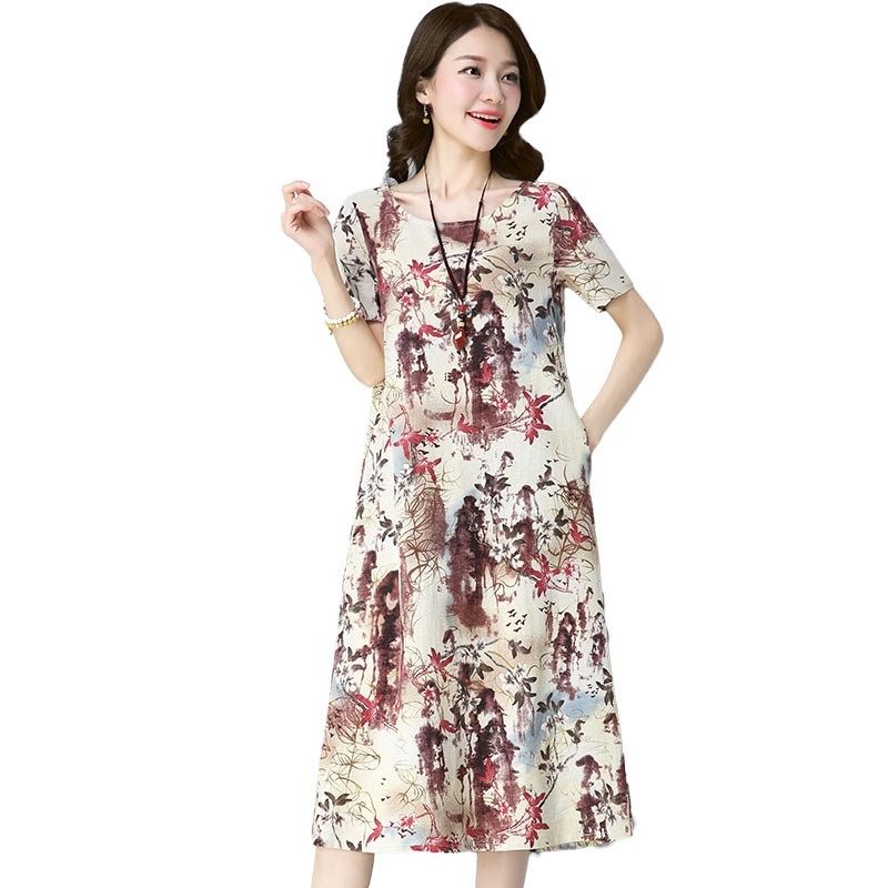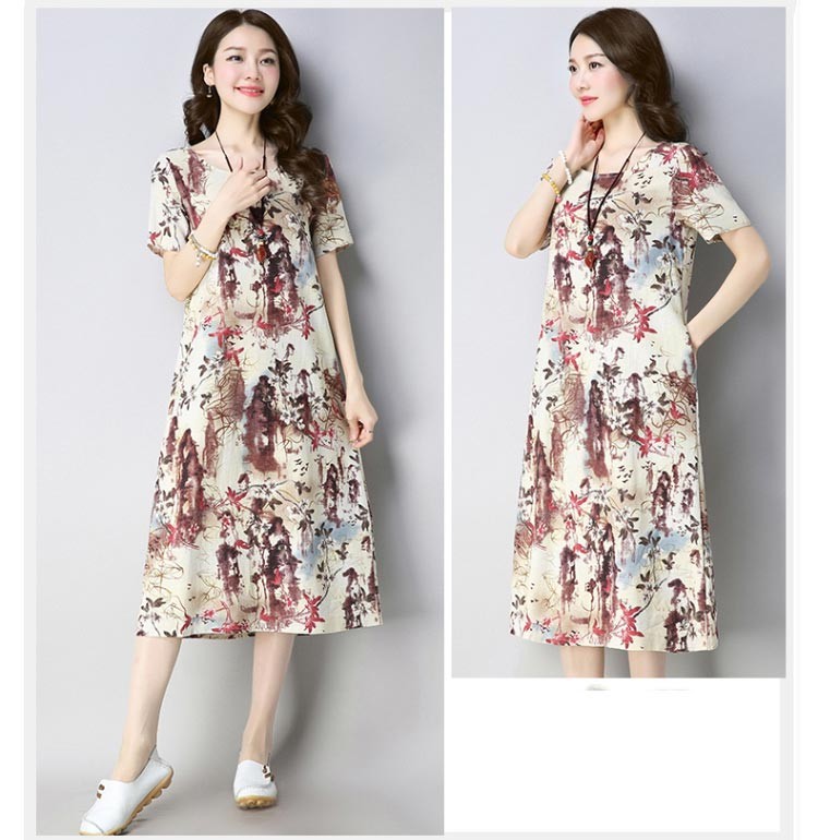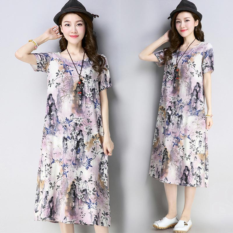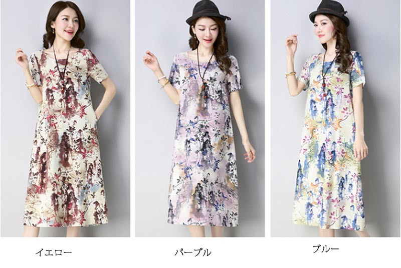 水墨画のようなシックな柄のコットン半袖ルーズシルエットワンピース♪