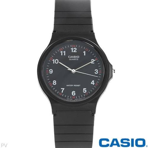The basic black-and-gold design of the Casio Men's Analog Watch makes it a simple, versatile timepiece great for everyday wear. The watch is constructed with a resin case, a black stationary resin bezel, and a comfortable black rubber bracelet with an adjustable buckle clasp. A durable mineral window protects the black dial face, which cleanly features gold-tone hour indexes, gold-tone minute markers, and complementary watch hands. This quartz-powered timepiece is backed by a one-year limited manufacturer's warranty.Feature
