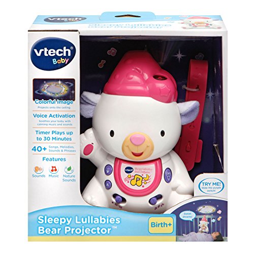 -. Binding : Toy -. Brand : VTech -. EAN : 3417761862506 -. Feature : Adorable Sleepy Lullabies Bear Projector projects a colorful image onto the ceiling to calm your baby / Plays white noise sounds to help block out everyday noises so your baby can fall asleep faster / Choose between three sound modes that play music, nature sounds or white noise; timer switch turns the bear off after ten or thirty minutes / Features voice activation that plays calming music to lull your child back to sleep; adjustable strap securely attaches the projector to the crib / Requires 3 AA batteries (batteries included for demo purposes only; new batteries recommended for regular use); intended for babies from birth to 3 years -. IsAdultProduct : 0 -. Label : V Tech -. Manufacturer : V Tech -. Model : 80-186250 -. MPN : 80-186250 -. PackageQuantity : 1 -. PartNumber : 80-186250 -. ProductGroup : Toy -. ProductTypeName : TOYS_AND_GAMES -. Publisher : V Tech -. ReleaseDate : 2016-02-01 -. Studio : V Tech -. Title : VTech Baby Sleepy Lullabies Bear Projector, Pink -. Warranty : 90 day warranty against manufacturer defects