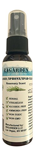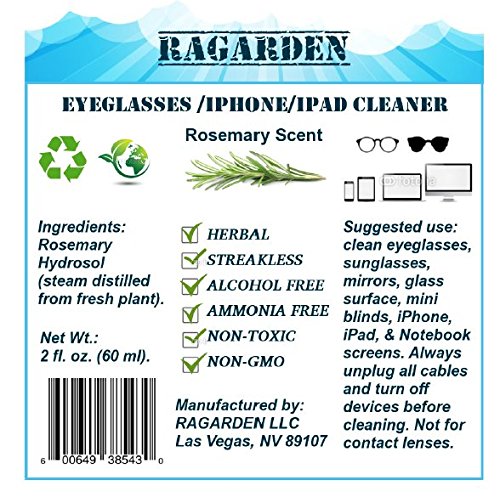 -. Feature : 100% Streakless, Herbal (pure rosemary scent). Natural, Non-Toxic, Alcohol Free, Ammonia Free, GMO-Free. / Sested use: clean eyeglasses, sunglasses, mirrors, glass surface, mini blinds, iPhone, iPad, & Notebook screens. Always unplug all cables and turn off devices before cleaning. Not for contact lenses. / Pure and contain no additives. Steam distilled from fresh rosemary plant. / GREAT GIFT IDEA for the holidays! 2 oz spray bottle. Made in USA. / Warning: RAGARDEN is the only seller and manufacturer of this product. Any offers by 3rd party sellers are not authorized by RAGARDEN and are not authentic RAGARDEN products.