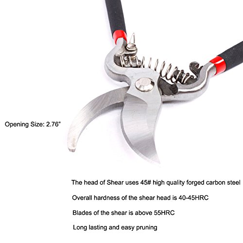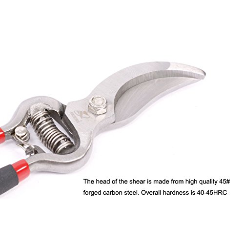 HIGH-CARBON STEEL MATERIAL- The shear head is made from high quality 45# forged carbon steel. Overall hardness is 40-45HRC, and the blades of the shear is above 55HRC. High hardness and harp blades make this garden scissors durable and long lasting