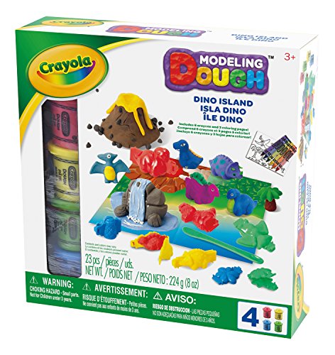 Imagine a world with dinosaurs! your child will have hours of fun using this Crayola dough Dino Island kit to create their own dinosaur Island! this kit includes 4 - 2 oz tubs of assorted colored dough, 6 crayons, 3 coloring pages, 5 Dino molds, 3-tree molds, modeling tool and 1 play mat. Recommended for ages 3 years and up.Feature