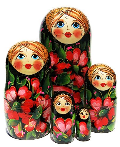 -. Title : Gerbera 5 Piece Russian Nesting Doll Red Flower Black Stacking Matryoshka Toy