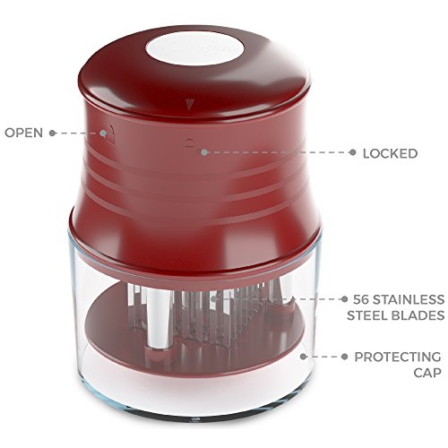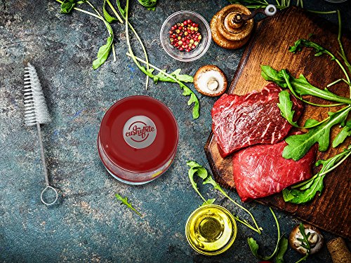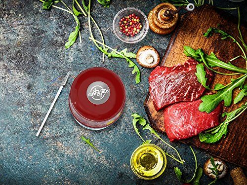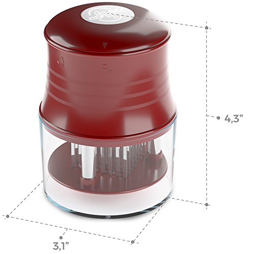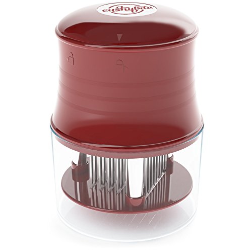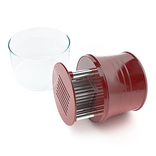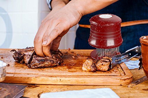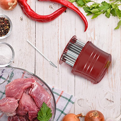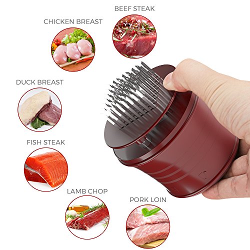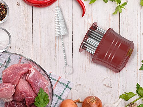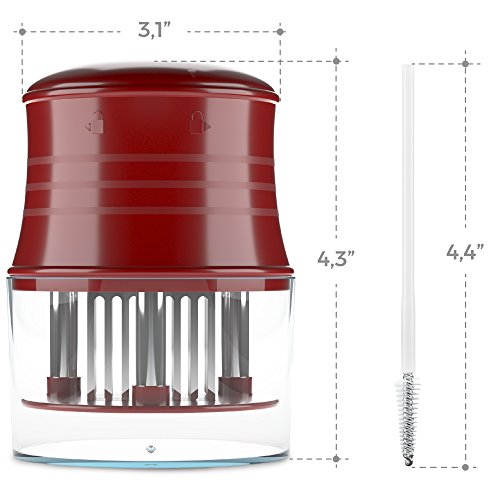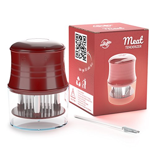 A premium product, designed to meet your appetite for a juicy steak, the meat tenderizer by CushyBite allows ample penetration of the marinade or rub. Elegant and efficient, our product can be referred to as a "gadget". It smartly punctures any type of meat as to ease the job of marinating and cooking. The sharp stainless steel blades assure durability - it will not break, stain or rust and an accident-free cooking experience due to the additional lock mechanism and protective cap. Add to cart and get: - 1 x Meat Tenderizer Material: 56 stainless steel blades, plastic handle Height: 4 inch Diameter: 2.7 inch Circumference: 10.2 inch Color: burgundy-red (for the plastic) Weight: 7.4 oz