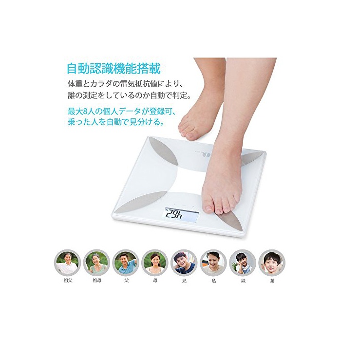 사용해 편리:자동 인식 기능 탑재 되고 있기 때문에,최대8명의 등록자 중에서,측정자가 자동으로 판정에 옵니다.그리고,오르는 것만으로,전원이 자동적으로 온이 되고, 측정 결과 표시 완료하면,자동 오프 입니다.