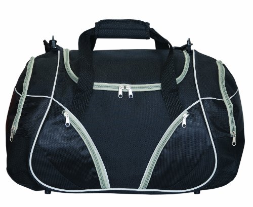 -. Binding : Misc. -. Brand : Bags For Less -. Color : Black -. Department : unisex-adult -. EAN : 0700175501653 -. Feature : Two front and two side zippered pockets , Grey piping and zippers strap / Two padded webbed carry handles, Two front and two side zippered pockets / Adjustable/detachable shoulder strap / Hard bottom board and four bottom feet / Black, 600D Polyester with Dobby accents Size: 20" W x 12.5" H x 12" D -. Label : Budget Bags Inc -. Manufacturer : Budget Bags Inc -. MPN : SP5773-Black-FBA-CA -. PartNumber : SP5773-Black-FBA-CA -. ProductGroup : Sports -. ProductTypeName : SPORTING_GOODS -. Publisher : Budget Bags Inc -. Size : 20" W x 12.5" H x 12" D -. Studio : Budget Bags Inc -. Title : Bags for LessTM Deluxe Sports Travel Duffel Bag, 20" Black -. UPC : 700175501653