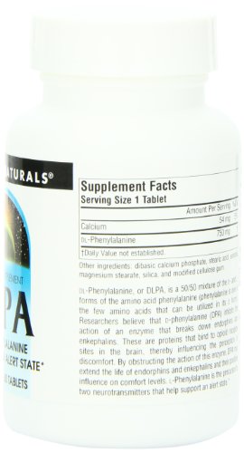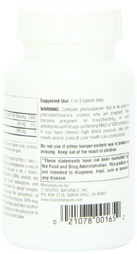 -. Binding : Health and Beauty -. Brand : Source Naturals -. Department : Nutritional Supplements -. EAN : 0021078001652 -. Feature : A 50/50 blend of the D- and L-forms of the amino acid phenylalanine / Phenylalanine is one of the few amino acids that can be utilized in its D- form / Researchers believe DPA inhibits the action of an enzyme that breaks down endorphins and enkephalins / DPA may extend the life of endorphins and enkephalins, and their positive influence on comfort levels / LPA is the precursor to two neurotransmitters that help support an alert state -. IsAdultProduct : 0 -. IsAutographed : 0 -. IsMemorabilia : 0 -. Label : Source Naturals -. LegalDisclaimer : These statements have not been evaluated by the Food & Drug Administration. This products is not intended to diagnose, cure, mitigate, treat, or prevent any disease. -. Manufacturer : Source Naturals -. Model : SN0165 -. MPN : SN0165 -. NumberOfItems : 1 -. PackageQuantity : 1 -. PartNumber : SN0165 -. ProductGroup : Health and Beauty -. ProductTypeName : HEALTH_PERSONAL_CARE -. Publisher : Source Naturals -. Size : 60 tabs -. Studio : Source Naturals -. Title : Source Naturals DL-Phenylalanine 750mg, 60 Tablets -. UPC : 021078001652