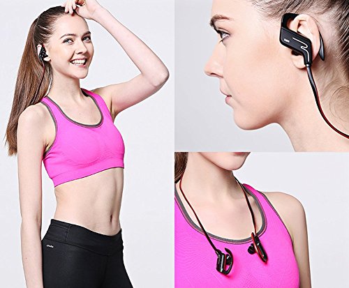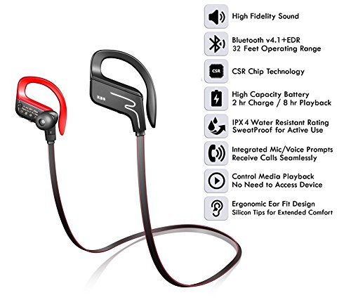 Package Includes - 1 x Bluetooth Headphone - 4 Sets Ear Tips, S, M, L - Micro USB Charging Cable - User Manual Features: - CVC6.0 Echo reduction + DSP digital noise reduction technology, enable clearer sound from microphone, you get high quality phone conversation even on the street or inside shopping mall - Premium sound with rich bass and crystal clear treble - Up to 8 hours music playing on a full battery charge - Comfortable, secure fit with ergonomic design - IP4-rated sweatproof and premium made with soft smooth silicone gel surface - Bluetooth V4.1 technology, compatible with all android, Apple and all bluetooth enabled devices - Adjustable earhooks, best fit for different size of ears, to make it more stable Technical Specification: Bluetooth version: V4.1 Transmission distance: 32 ft Talk/music playtime: 6-8 hours Standby Time : 80 hours Charging time: 2 hours Noise reduction: CVC6.0 Charging: red light when charging, blue light when fully charged Studies have confirmed what fitness enthusiasts have always known--listening to music helps you work out harder and improves your endurance.Feature