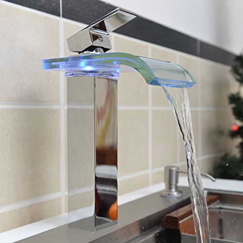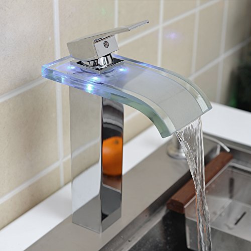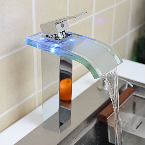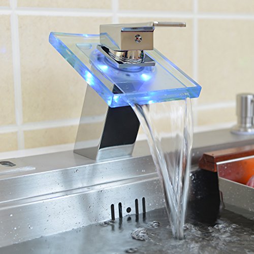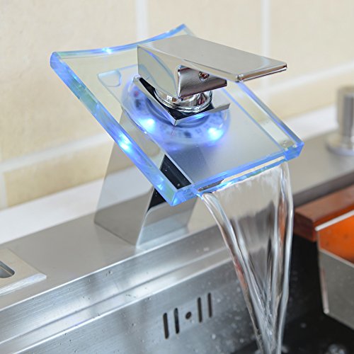 -. Brand : Harrahs -. Feature : Solid and firm brass construction / Hot Water - Red Light, Cold Water - Blue light. / Brushed chrome finish with solid brass construction which ensures durability and longer life. / Beautiful chrome finish, build to resist scratches, corrosion and tarnishing / Advanced ceramic disc valve technology guarantees of no leaks -. Label : Kaffiso Hard Mfg. Ltd -. Manufacturer : Kaffiso Hard Mfg. Ltd -. ProductGroup : Home Improvement -. ProductTypeName : PLUMBING_FIXTURE -. Publisher : Kaffiso Hard Mfg. Ltd -. Studio : Kaffiso Hard Mfg. Ltd -. Title : Harrahs Waterfall Bathroom Sink Faucet Color Changing LED Glass Spout Chrome Finish¡