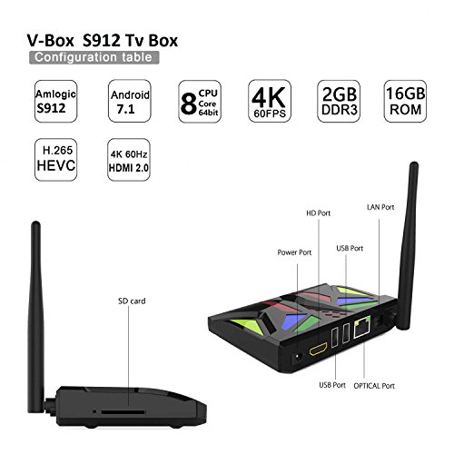 Studio : RBSCH Publisher : RBSCH Binding : Electronics Product Description 2017 Version Android 7.1 TV Box Octa Core 2GB RAM 16GB ROM Amlogic S912 with Bluetooth Wifi 5G Supporting 4K 60Hz Full HD Player 1000M Lan Specification : CPU: Amlogic S912 Octa core ARM Cortex-A53 CPU up to 2GHz GPU: ARM Mali-T820MP3 GPU up to 750MHz FLASH: Original 16GB EMMC SDRAM: 2GB DDR3 Power: Supply DC 5V/2A Power: Indicator (LED) Power ON :blue Power: Indicator (LED) Plastic material OS: Android 7.1 WIFI/BT: 2.4GHz/5GHz/BT 3D Hardward 3D graphics acceleration Support Decoder format: HD MPEG1/2/4,H.264, HD AVC/VC-1,RM/RMVB,Xvid/DivX3/4/5/6 ,RealVideo8/9/10 Support Media format: Avi/Rm/Rmvb/Ts/Vob/Mkv/Mov/ISO/wmv/asf/flv/dat/mpg/mpeg Support Music format : MP3/WMA/AAC/WAV/OGG/AC3/DDP/TrueHD/DTS/DTS/HD/FLAC/AP Support Photo format: HD JPEG/BMP/GIF/PNG/TIFF USB host: 2 High speed USB 2.0,support U DISK and USB HDD Card reader: SD/SDHC/MMC cards HDD file system: FAT16/FAT32/NTFS Support Subtitle: SRT/SMI/SUB/SSA/IDX USB High Difinition video: output SD/HD max.1920x1080 pixel OSD type of languages: English/French/German/Spanish/Italian/ etc multilateral languages LAN Ethernet: 10/1000M, standard RJ-45 Wireless Built in WiFi Mouse/ Keyboard:Support mouse and keyboard via USB;Support 2.4GHz wireless mouse and keyboard via 2.4GHz USB dongle HD HD 2.0 up to 4k2k Output 4K2k hd decoding 4k2k H.265 Hardware Video Decode and 4k2k Output 1080P/AV/Dolby/3G Support SPDIF/IEC958 Coaxial We are professional on android TV box, Please DO CONTACT our customer service. we are hoping to offer you the best service. 0
