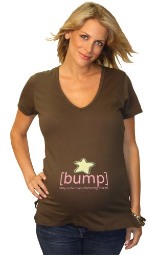show everyone who the star of the show is with our super cool, extra soft, stretchy [bump]-vee which is designed to proudly show off your voluptuous wastline. this stylish 100% combed cotton fine jersey short sleeve sexy V-neck tee will take you from here to maternity. 3" side vents. army [bump]-vee with bubble gum pink print and lime green star outlined with peridot Swarovski crystals. Available in S/M & L/XL. made in the USA.
