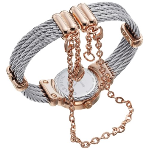 Pink gold-plated stainless steel case with a stainless steel chevron cable bracelet with attached jewelry chain. Fixed pink gold-plated bezel. Mother of pearl dial with pink gold-tone hands and diamond hour markers. Dial Type: Analog. Quartz movement. Scratch resistant sapphire crystal. Pull / push crown. Solid case back. Case diameter: 21 mm. Case thickness: 6 mm. Round case shape. Band width: 10 mm. Band length: 7 inches. Jewelry clasp. Water resistant at 30 meters / 100 feet. Functions: hour, minute. Dress watch style. Watch label: Swiss Made. Charriol St Tropez Mother of Pearl Diamond Ladies Watch ST20CP1520RO004.Feature