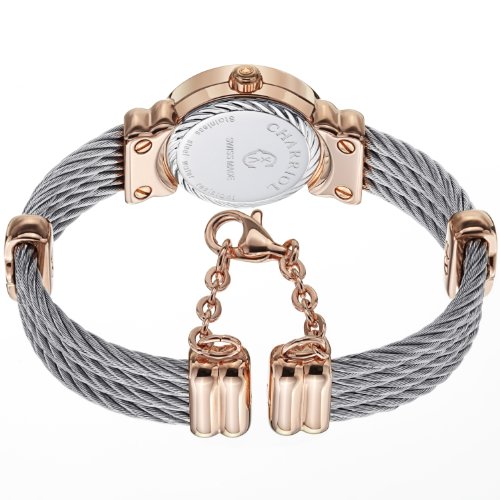 Polished rose goldtone stainless steel case, Stainless steel chevron cable bracelet, Stainless steel caseback (screw-in), Bezel engraved with "Charriol"