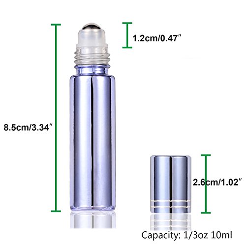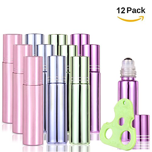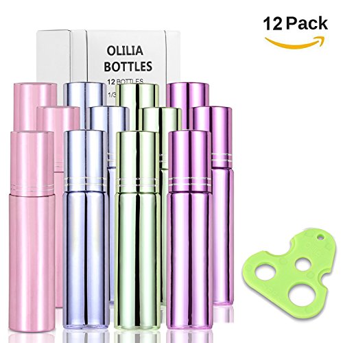 Olilia Glass Roll on Bottles with Metal Roller Balls - Essential Oils Key included 12 Pack of 10ml(1/3oz) Mixed Color