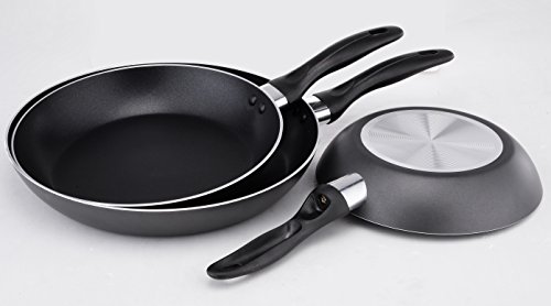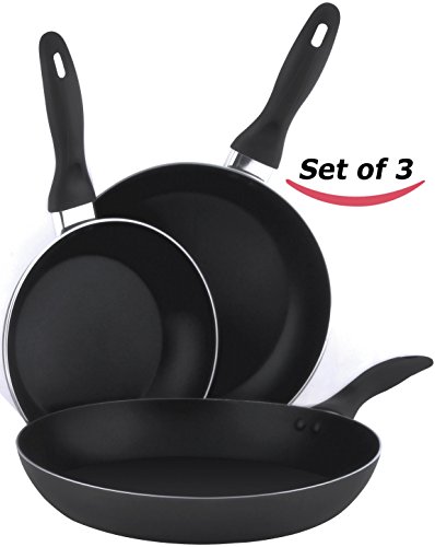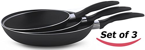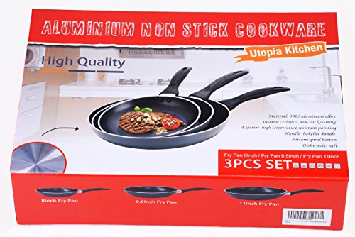 • VALUE SET - 3-Piece Frying Pan Cookware set includes one 8" Inch, one 9.5" Inch, and one 11" Inch Frying Pan. Utopia's Nonstick Frying Pans are formed with multi-layer nonstick for ultra-durability. The spectacular, modern design looks elegant in the kitchen, and designed in such a way to ensure ensures even heating.