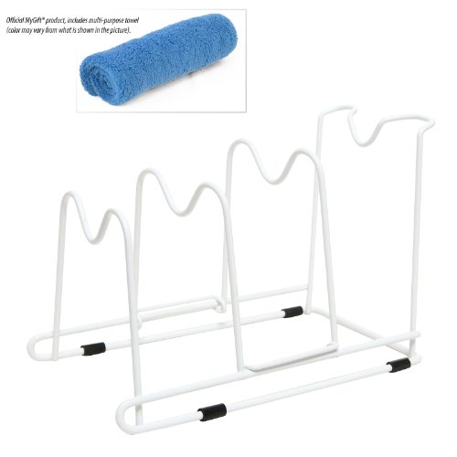 - Feature : Sturdy metal organizing stand designed to hold pots, pans, lids and cutting boards / Features 4 tiers that can be adjusted to accommodate the size of your cookware / This free-standing organizer can be used vertically or horizontally / Made of metal with a white finish. Includes metal cookware organizer and a MyGift® cleaning towel. Other items not included. / Approximate Dimensions: 12.5" L X 7" W X 8.25" H.