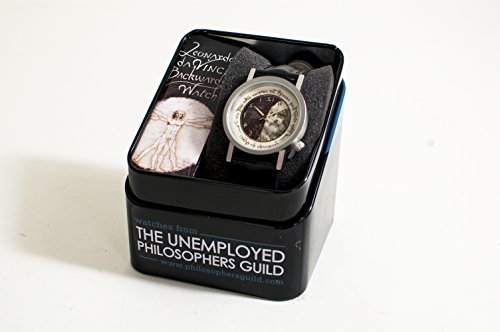 -. Feature : A masterpiece among watches. Inspired by Leonardo's notebooks, this watch tells time backwards. The numbers are backwards. Everything is backwards. Look at in a mirror and it looks like a normal (but beautiful) watch. / FEATURES - A 33mm diameter face, vegan immitation leather band, and accurate Japanese quartz movement. The watch is water resistant (not water proof), and truly a delight. Battery included. / COMES IN TIN GIFT BOX - Our watches make a great present for the intellectual or philosophical person in your life who just wants to keep accurate time. They come boxed in a beautiful tin that doubles as a display case for when you're being futuristic and keeping time on your phone. / ONE YEAR WARRANTY - This attractive timepiece has a 1 year manufacturer warranty. If you purchase from The Unemployed Philosophers Guild, and experience any issues, please contact us and we'll send a replacement. / FROM THE UNEMPLOYED PHILOSOPHERS GUILD - Don't worry. We are employed, just not as philosophers. We're a small, Brooklyn based company specializing in gifts for the sophisticated gift giver. For whatever you need, we have presents of mind.