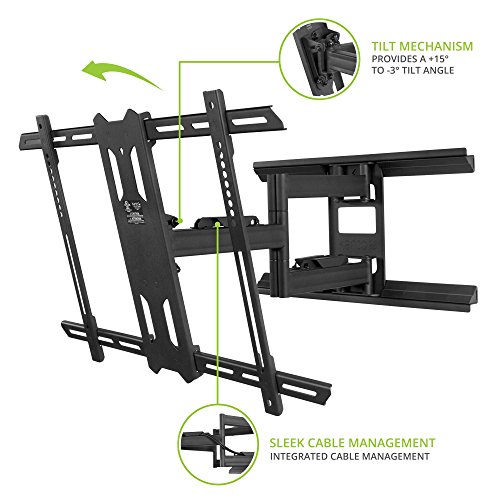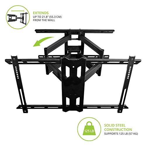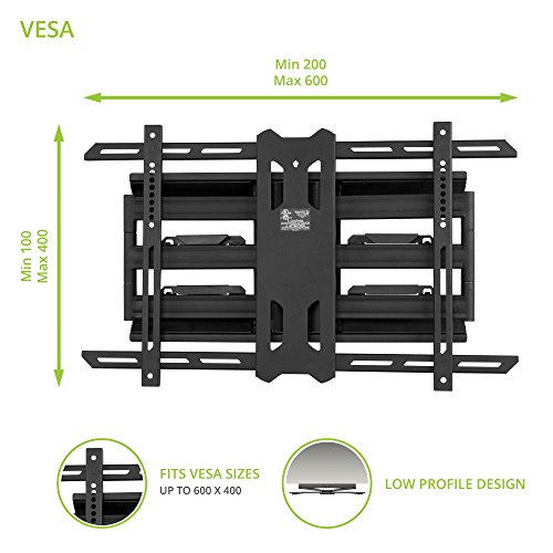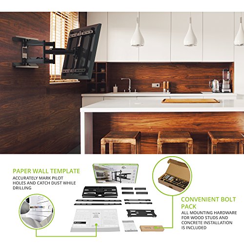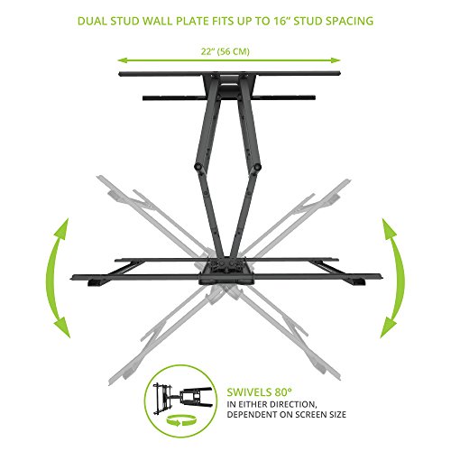 -. Feature : Fits most flat panel TVs from 37" to 75", supports TVs up to 125 lb (57 kg), accommodates VESA sizes from 200x100 to 600x400 / Sits 2" (5 cm) from the wall, extends up to 21.8" (55.3 cm) from the wall, integrated cable management system / Accessible tilt mechanism provides a +15 Degree to -3 Degree tilt angle, 80 Degree of swivel in either direction, dependent on screen size. / 22" (56 cm) dual stud wall plate accommodates up to 16" stud spacing, solid steel construction with durable powder coated finish / Installation manual and all mounting hardware for wood studs and concrete installation is included