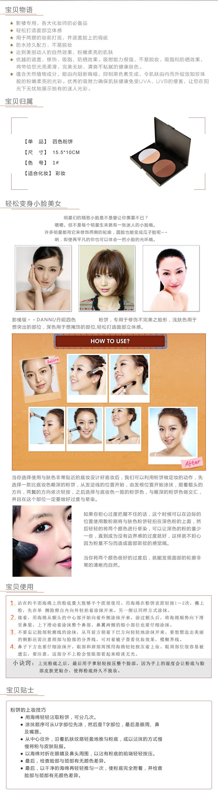 粉质细腻轻盈,上色均匀,极易贴合肌肤,瞬间提亮肤色,打造自然好气色。能有效的修饰脸型,轻松塑造立体小颜五官,适合各种肤质。