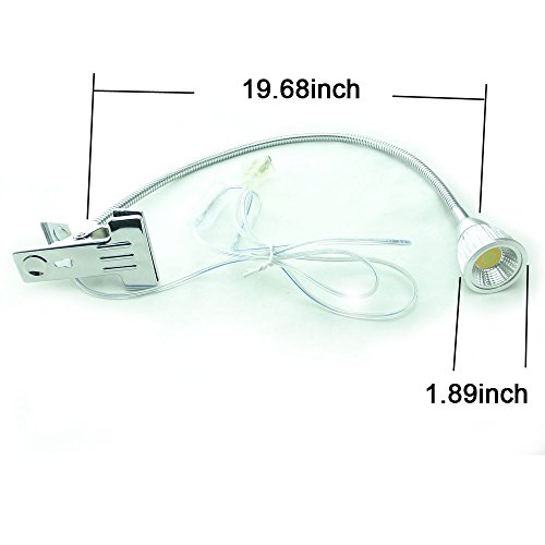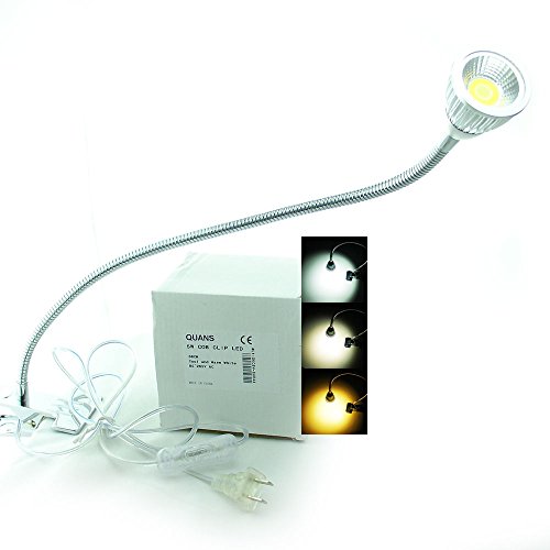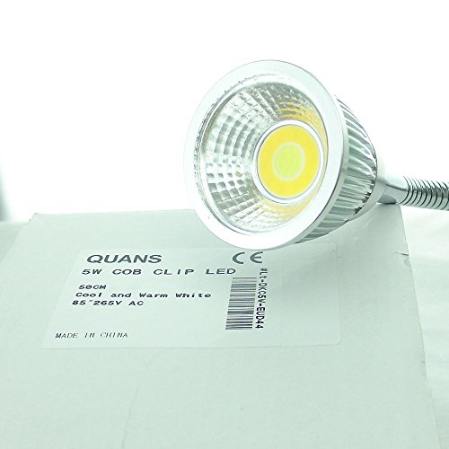 -. Feature : QUANS Ultra Bright 5W COB Clip LED light / 3 Colors in one. Cool white, Warm White, Cool white+Warm White / Switch on and off to change color , Wire Length :5.25ft with Plug, Switch is in the middle / Light Cup diameter 1.89 inch , Beam angle 120 degree, Input Voltage : 85-265V AC (110V or 220V) / Tube Size: 50cm 19.68 inch, Strong Tube to hold. Clip on surface up to 3-3.4cm (1.18-1.34inch)