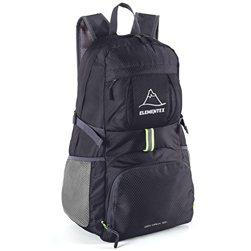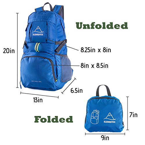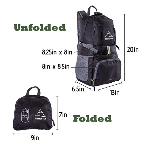 -. Feature : Package Includes: 1 - Foldable Lightweight Travel Backpack (35L Capacity) / FOLDABLE & PORTABLE: 20" x 13" backpack folds down to a compact 9" x 7" pack that zips up and weighs only 0.83 lbs. - the ideal lightweight daypack for hiking, backpacking, camping, trekking, sports, outdoors activities and traveling. Conveniently pack it in your lage or backpack for short excursions. / WATER & TEAR RESISTANT: Polyurethane construction reinforced with a honeycomb stitch is durable and water resistant. Adjustable shoulder straps with sponge padding ensure comfort and reduce shoulder strain. Spacious main compartment with double-layer bottom protects gear and equipment. / STORAGE & SAFETY: Includes 2 front pockets (8" x 8" / 7" x 9") for easy access to accessories. 2 side mesh pockets (5" x 6") hold even the largest water bottles (diameter up to 5") or umbrellas. Comes with reflectors and chest strap with built-in whistle. When folded up, the pack has a front zip mesh pocket. The unisex design and color options are great for men, women, adults, kids, boys and girls. / EXCEPTIONAL CUSTOMER CARE: Your ELEMENTEX Folding Hiking Travel Back Pack comes standard with a hassle-free 90-Day Money Back Satisfaction Guarantee, and a 1-Year Limited Manufacturer's Warranty from the date of purchase which covers manufacturing and material defects.