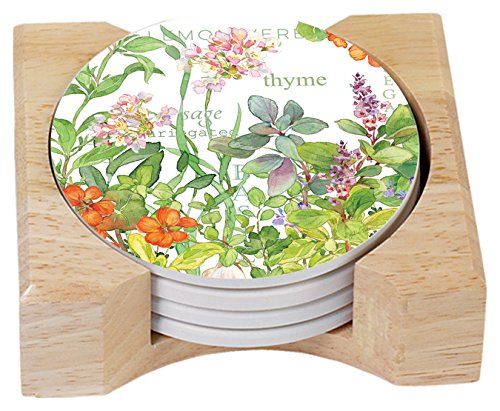 - Coasters are natural stoneware with decorative transfer print
