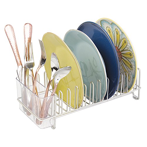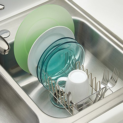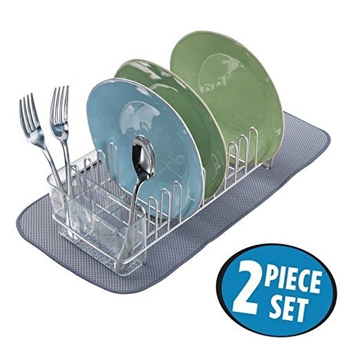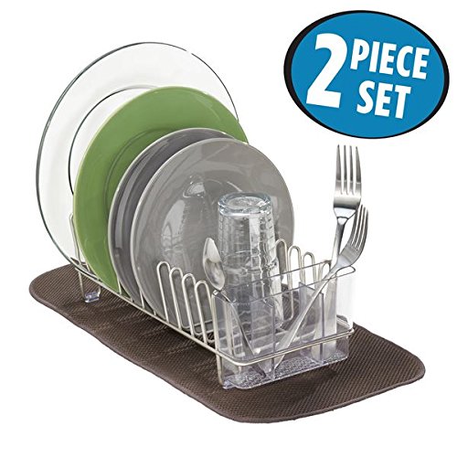 mDesign Compact Dish Drainer Rack and Mini Drying Mat for Kitchen Countertops - Set of 2, Satin/Pewter