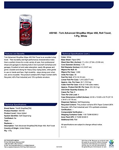 Studio : SCA Americas LLC Publisher : SCA Americas LLC Binding : Misc. Product Description Tork Advanced ShopMax Wiper 450 Roll Towel is an excellent shop towel. Their durability and high-performance characteristics make them a perfect choice for a wide variety of uses, from professional shops and garages to cleaning tools in do-it-yourself workshops and garages. Excellent oil and water absorption, easily lifts grease and grime. Durable and strong for heavy-duty wiping tasks, while gentle to use on hands and face. High durability - stays strong even when wet, and is reusable. This product contains 85% paper content (60% recycled, 40% post-industrial fiber) and 15% synthetic emulsion. 0