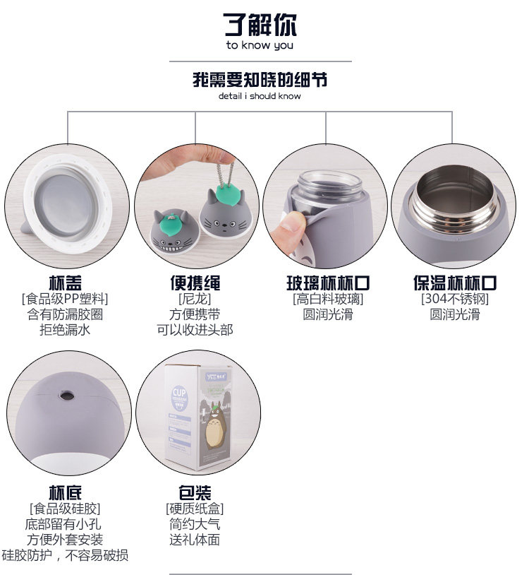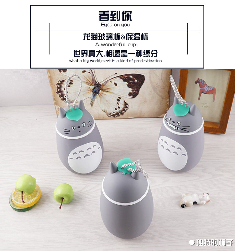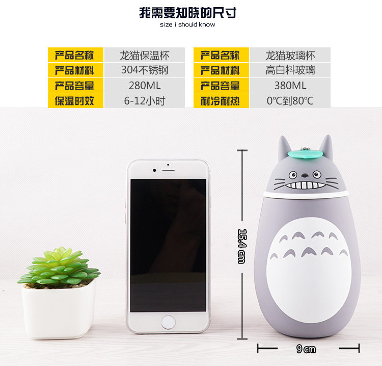 龙猫玻璃杯:内胆采用高白料玻璃,杯盖采用食品级PP塑料,杯身套采用食品级硅胶。杯子容量:380ml,杯身高度:15.4cm,杯底直径:9cm。耐温性能:0℃~80℃。龙猫保温杯:内胆采用304不锈钢,杯盖采用食品级PP塑料,杯身套采用食品级硅胶。杯子容量:280ml,杯身高度:15.4cm,杯底直径:9cm,保温时长 68℃以上(6~12小时),保冷时长 9℃以下(6~12小时)