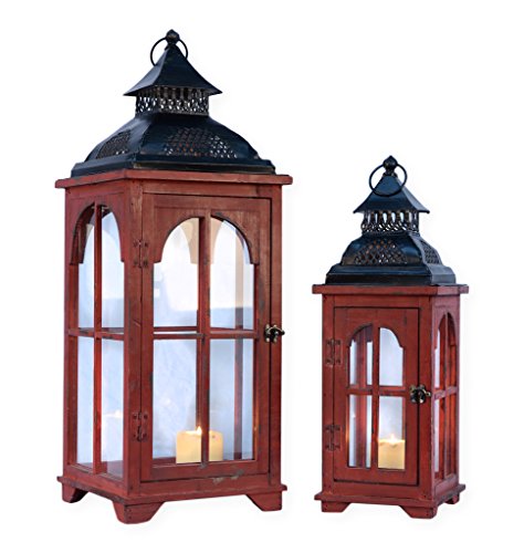 Red and Black Window Pane Large and Small Wood and Metal Christmas Lantern Set of 2