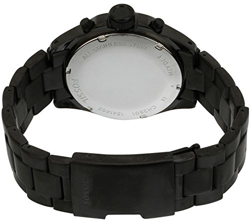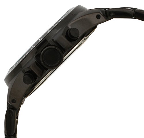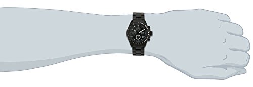 Black watch with sporty techymeter bezel, raised crown, and round dial with white accented hands, date window, and chronograph subdials