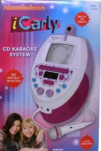 Sing your heart out to your favorite karaoke songs and watch yourself on screen. Imagine yourself as a superstar on TV while you sing along to the lyrics as they appear on the monitor. This iCarly CD Karaoke System is perfect for your future pop star waiting in the wings and has a great iCarly graphic. iCarly CD Karaoke System features: 5 inch black and white Monitor (measured diagonally) Front loading CD/CD + G graphics player 20 track programmable memory Enhanced vocal effects like echo and balanced control Awesome auto voice control Video and audio input/output Built-in swivel head camera Dual microphone jacks (one microphone included) Built-in speaker system Package includes: Karaoke System, Hand Held Microphone, AV Cables, AC Adapter, and User Manual.