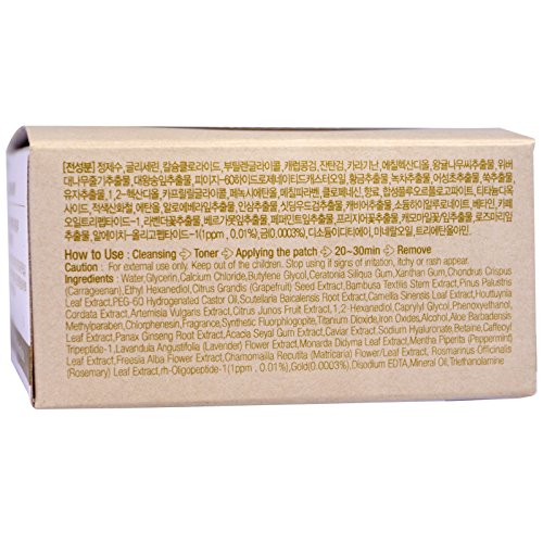 Suggested Use How to Use Use the spoon included in the container when taking out the patches. Apply eye patches onto under eyes and remove them after 30 minutes. Use spot patches in the same way (for used between eyebrows or any concerned spots). Apply it onto face or body. Other Ingredients Water, glycerin, calcium chloride, butylene glycol, ceratonia siliqua gum, xanthan gum, chondrus crispus (carrageenan), ethyl hexanediol, citrus grandis (grapefruit) seed extract, bambusa textilis stem extract, pinus palustris leaf extract, peg-60 hydrogenated castor oil, scutellaria baicalensis root extract, camellia sinensis leaf extract, houttuynia cordata extract, artemisia vulgaris extract, citrus junos fruit extract, 1,2-hexanediol, caprylyl glycol, phenoxyethanol, methylparaben, chlorphenesin, fragrance, synthetic fluorphlogopite, titanium dioxide, iron oxides, alcohol, aloe barbadensis leaf extract, panax ginseng root extract, acacia seyal gum extract, caviar extract, sodium hyaluronate, betaine, caffeoyl tripeptide-1, lavandula angustifolia (lavender) flower extract, monarda ddyma leaf extract, mentha piperita (peppermint) leaf extract, freesia alba flower extract, chamomailla Recutita (matricaria) flower/leaf extract, rosmarinus officinalis (rosemary) leaf extract, rh-oligopeptide-1 (1ppm, 0.01%), gold (0.0003%), disodium EDTA, mineral oil, triethanolamine. Warnings For external use only. Keep out of the reach of children. Stop using if signs of irritation, itchy or rash appear.Feature
