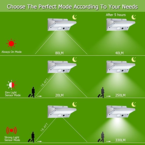 - 【3 Adjustable Modes Motion Activated Solar Security Light】 This solar motion light have 3 working modes with three color indicator lights –Dim Light Sensor Mode: Dim to bright when motion detected (Green); Strong Light Sensor Mode: Stay off until motion detected (Blue); Always On Mode (Red). The Mode button will ONLY function when the solar panel is in darkness!
